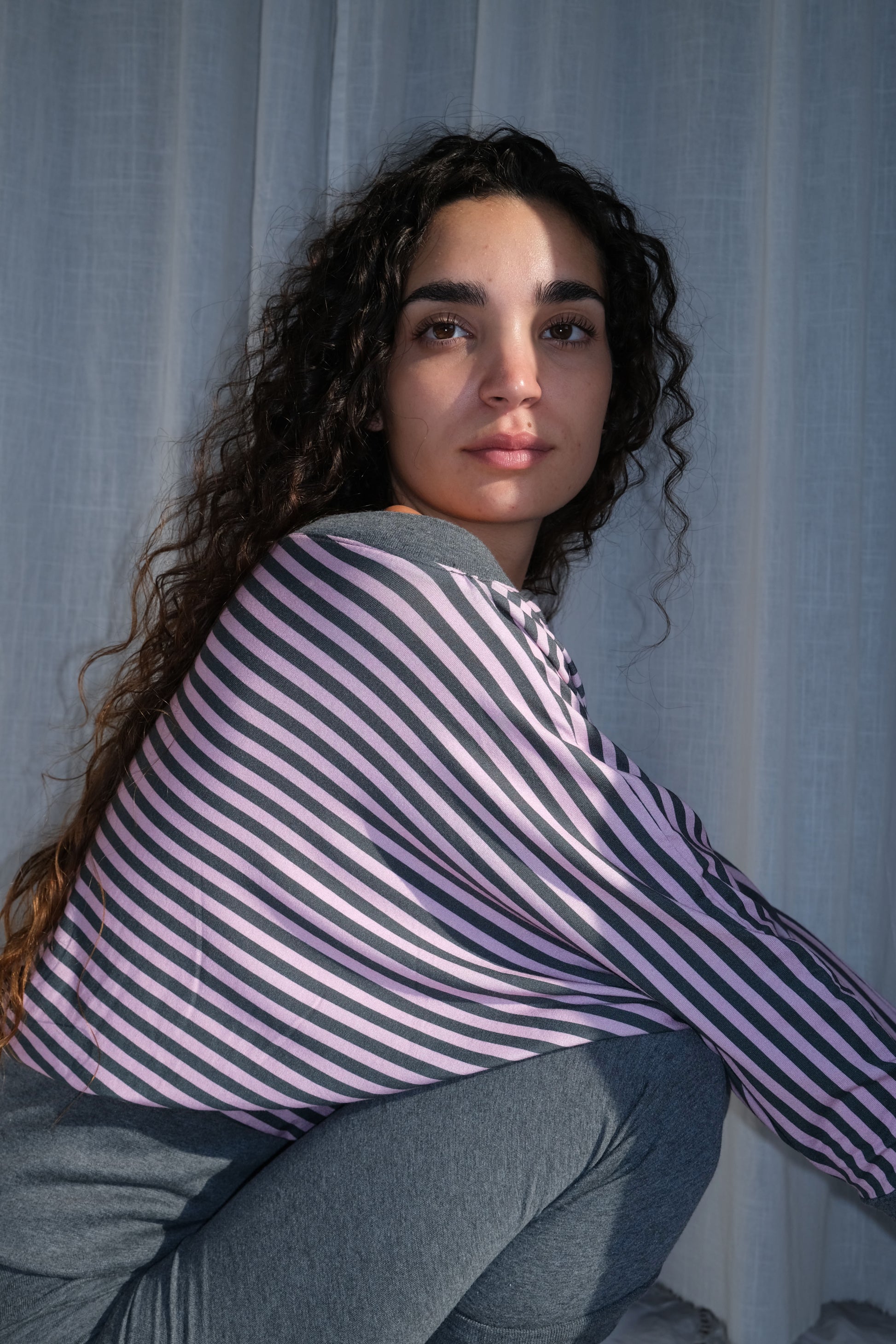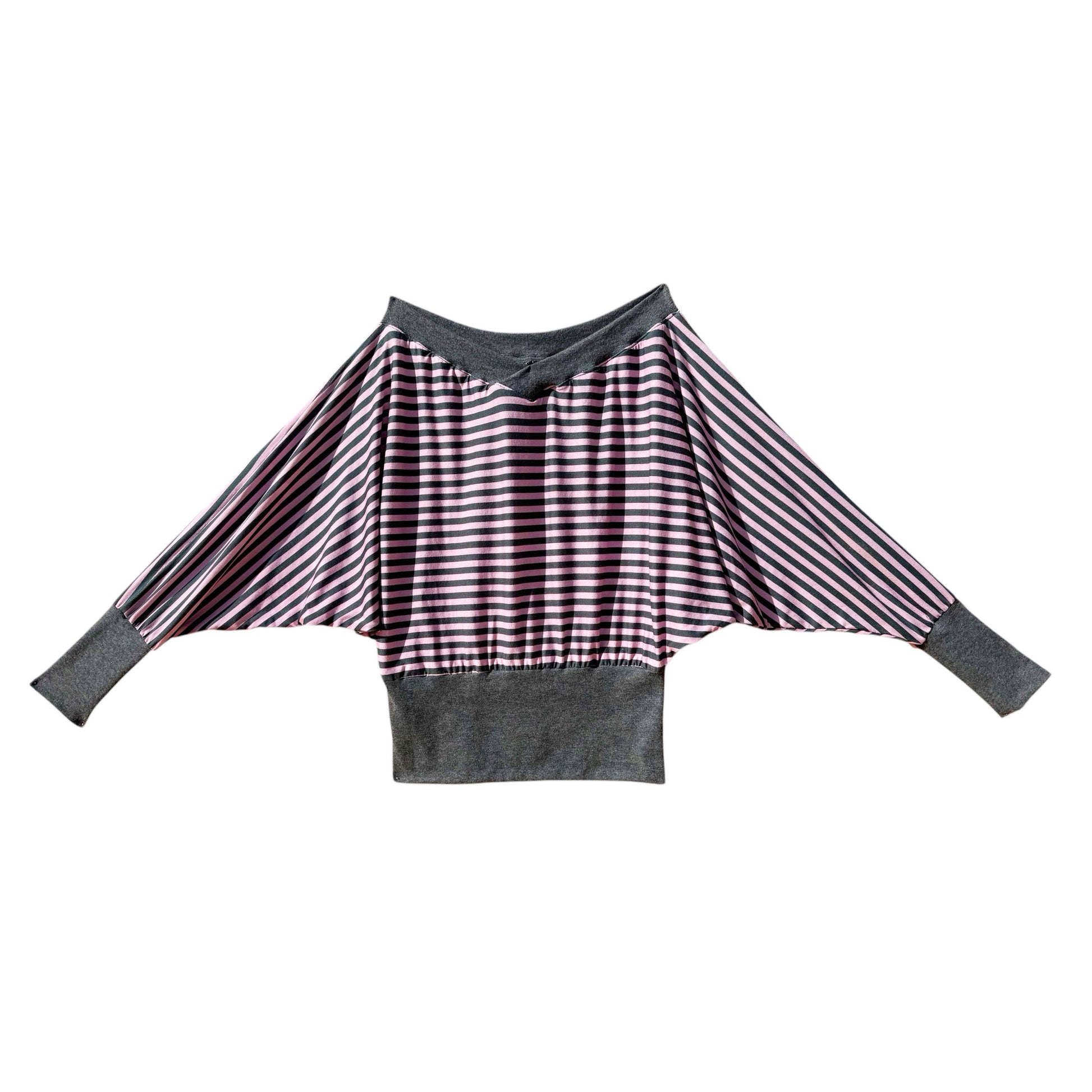 V-neck top with batwing sleeves in a dark gray and pink striped print. The model is wearing a size S.