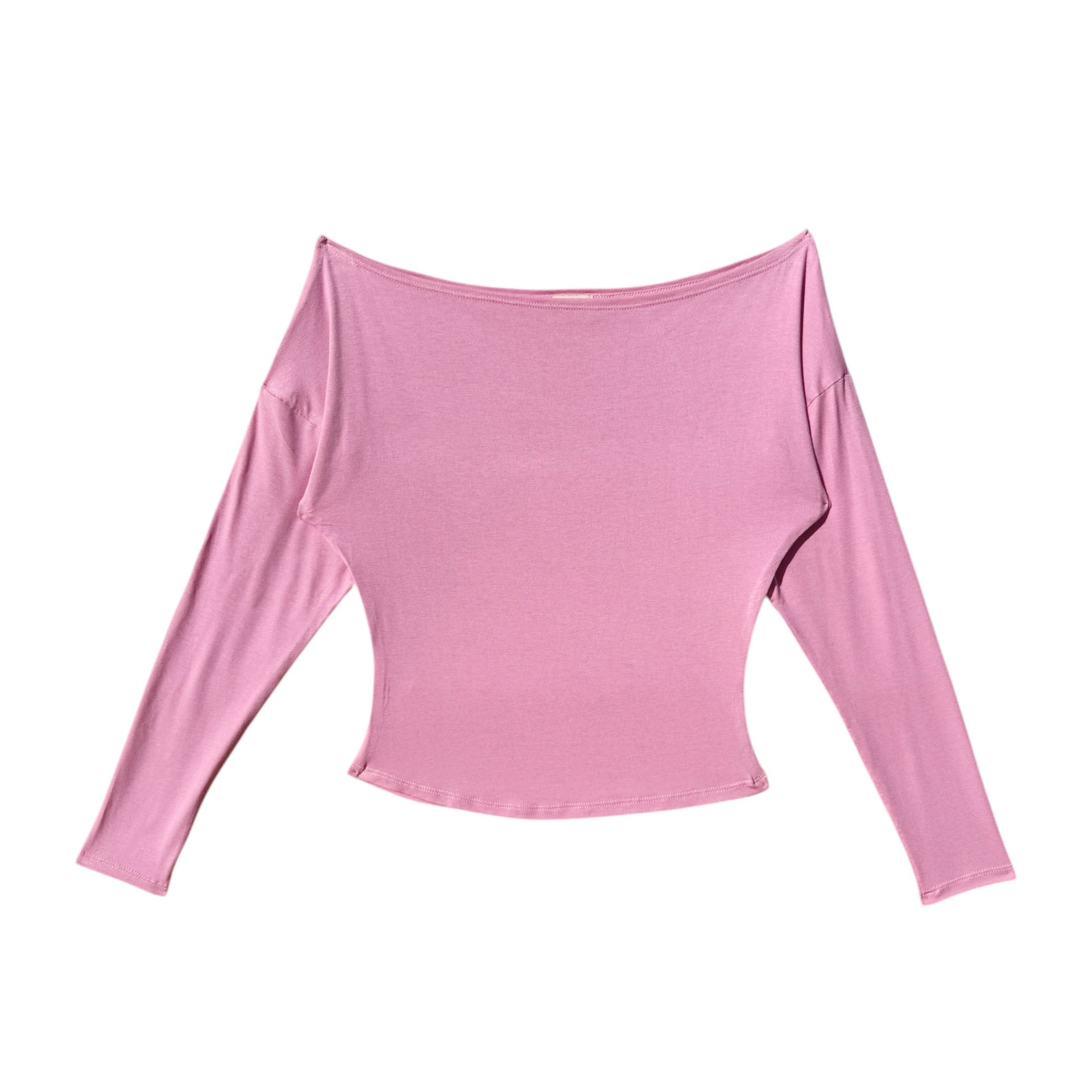 Bubblegum pink off-the-shoulder top with a dropped neckline and long sleeves. The model is wearing a size S.