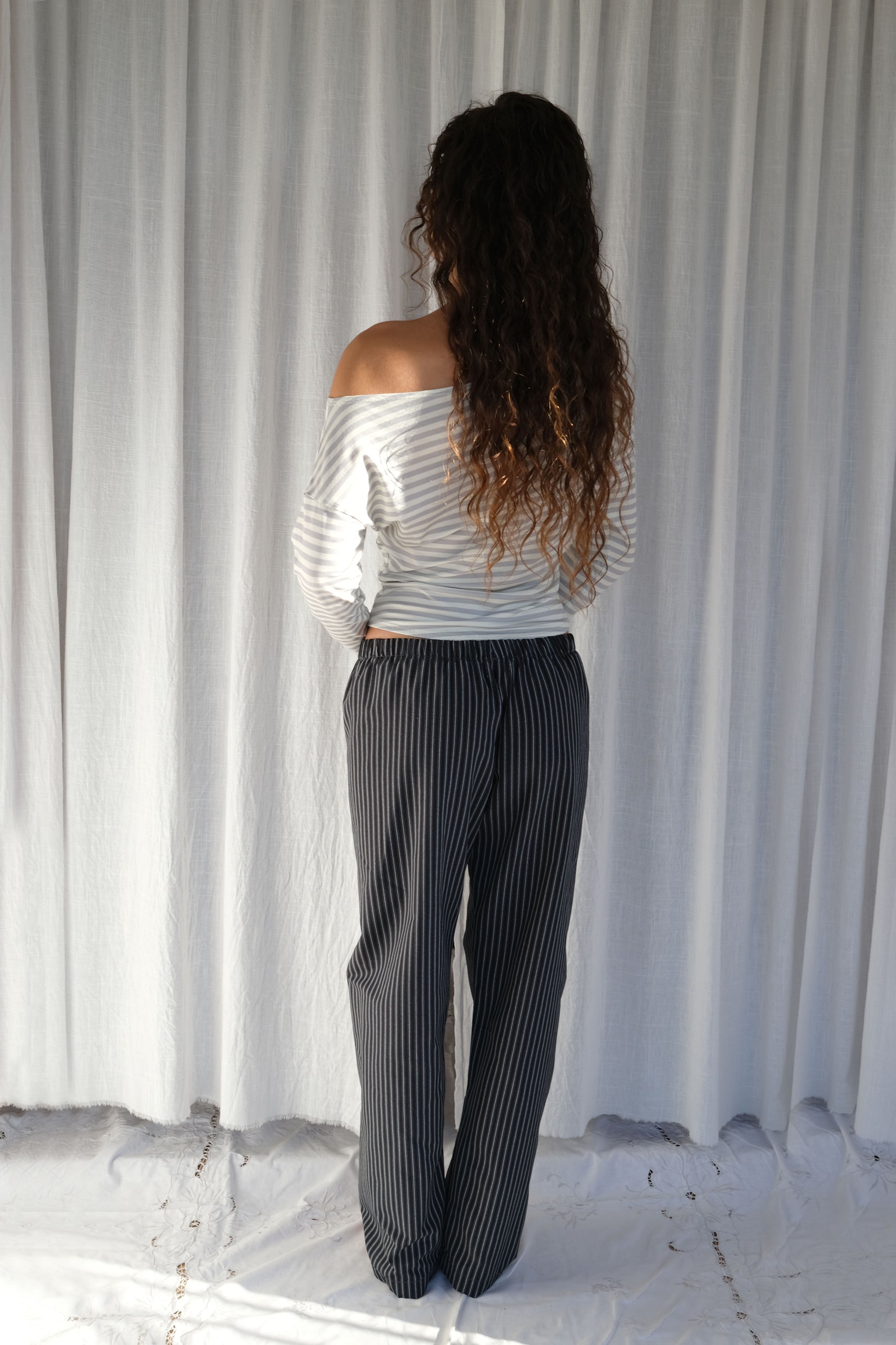 top con escote caído, hombros descubiertos y manga larga en estampado de rayas gris claro y beige. La modelo lleva la talla S.