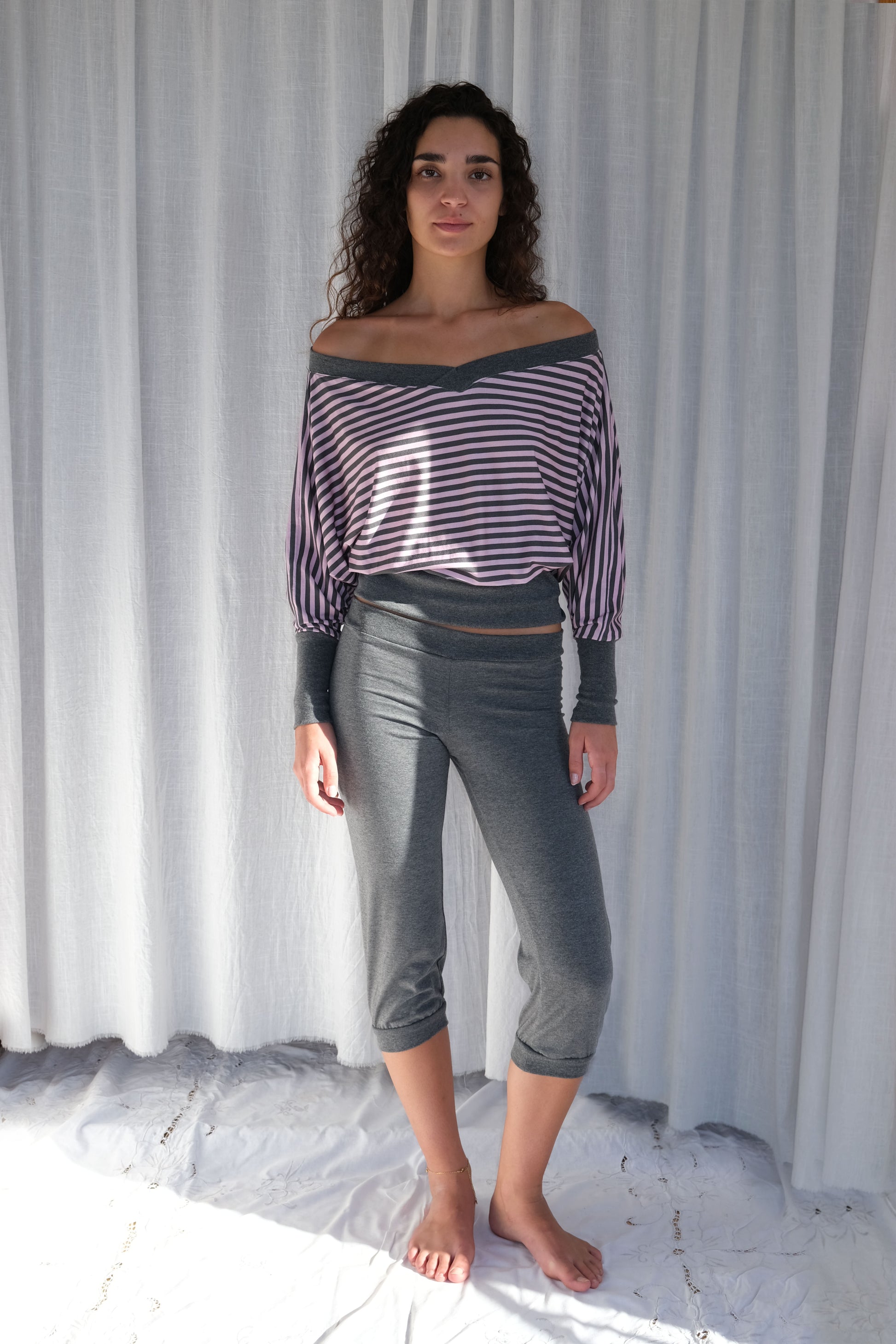 top con escote pico y manga murciélago en estampado de rayas gris oscuro y rosa. La modelo lleva la talla S.