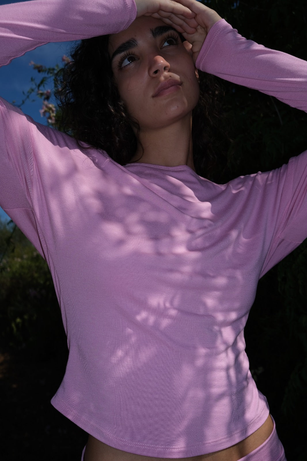 top con escote caído, hombros descubiertos y manga larga en color rosa chicle. La modelo lleva la talla S.