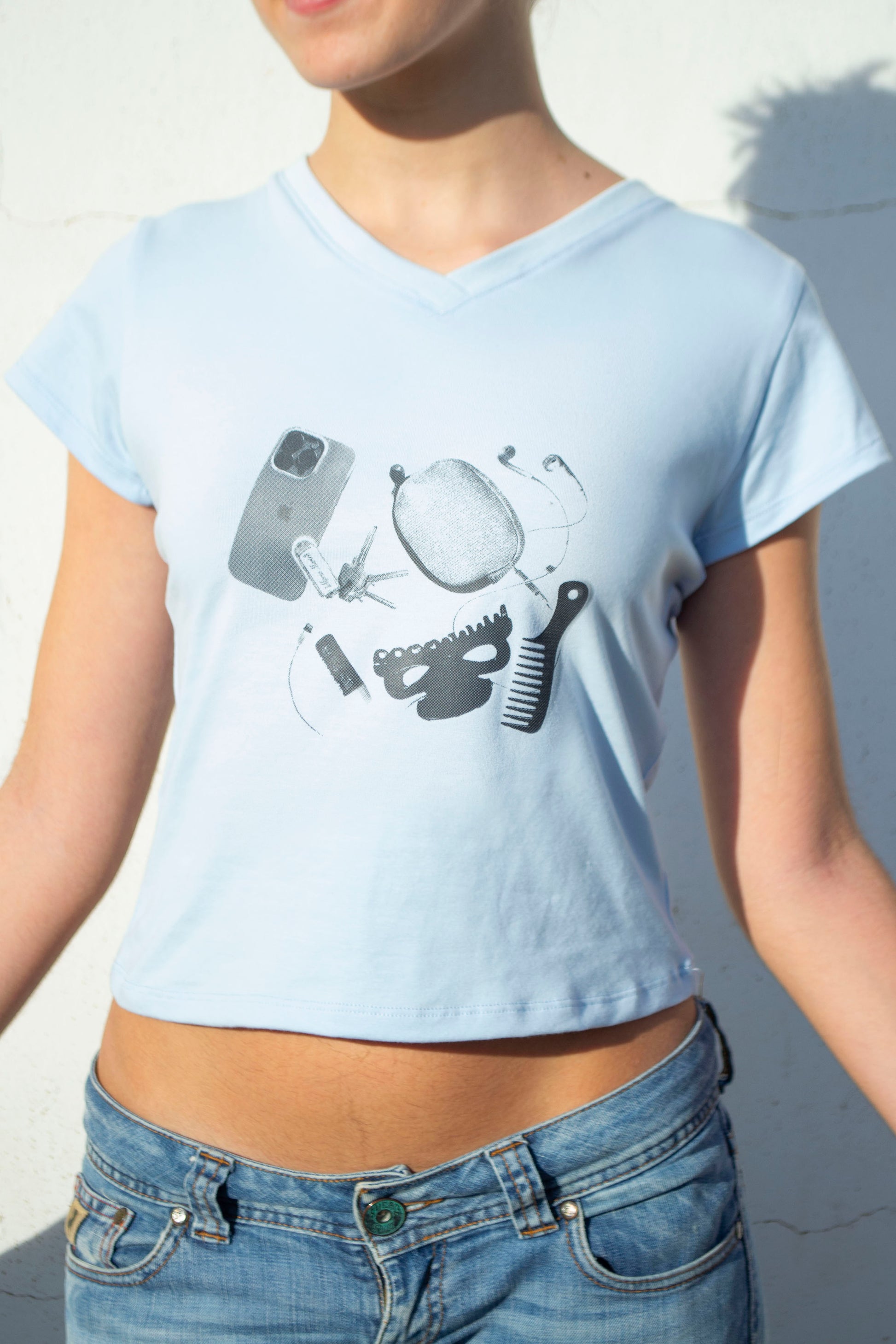 Camiseta gráfica Baby Tee de manga corta y cuello de pico. Color azul celeste. La modelo lleva la talla XS.